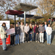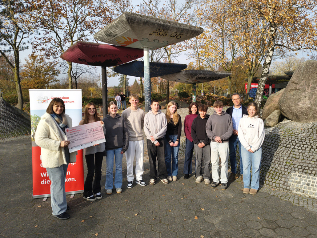 Bei der Spendenübergabe Mitte November traf Monika Schnellenbach, Vorstandsmitglied der Kinderkrebshilfe Münster, eine Abordnung der engagierten Schüler:innen sowie Volker Ludwig, Schulleiter des Gymnasiums und berichtete von der Arbeit des Vereins. Dabei ermutigte sie die anwesenden Jugendlichen, mit erkrankten Mitschülerinnen und Mitschülern in Kontakt zu bleiben.