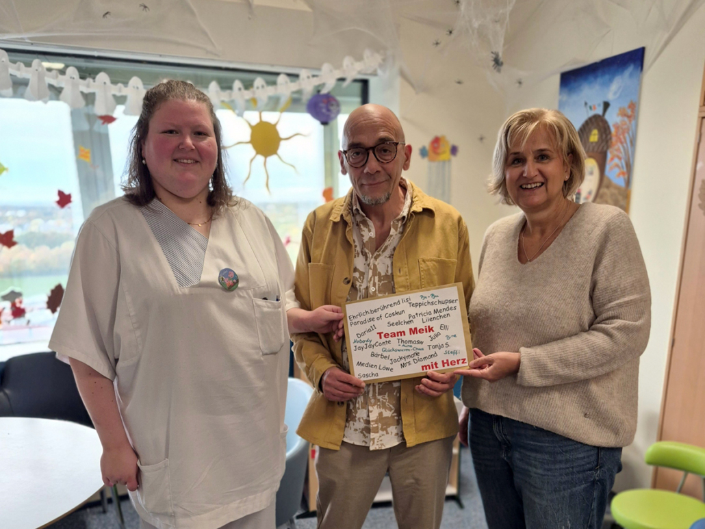 Meik Stachowiak hatte in den vergangenen Monaten über TikTok zu Spenden für einen guten Zweck aufgerufen. Ende Oktober besuchte er die kinderonkologische Station des UKM und wurde von Nicole Wiggermann, Vorstandsmitglied der Kinderkrebshilfe, und Kinderkrankenpflegerin Wiebke Dirksen-Salawu begrüßt. Er überreichte 200 € für die Arbeit der Kinderkrebshilfe sowie gehäkelte Glücksbären für die Kinder auf der Station. Nicole Wiggermann freute sich über die Spende und berichtete von den wichtigen Projekten zugunsten der schwer erkrankten Patientinnen und Patienten, die mit Spendengeldern finanziert werden.
