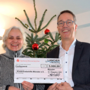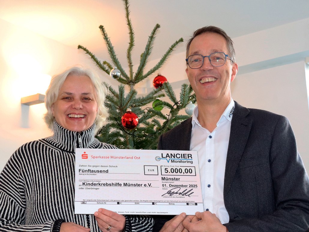 Anfang Dezember übergab Geschäftsführer Ludger Tidde am Firmensitz von LANCIER Monitoring den Spendenscheck über 5.000 € an Ulrike Philipzen, Vorstandsmitglied der Kinderkrebshilfe. Mit dieser Spende möchte das Unternehmen krebskranken Kindern und ihren Familien ein Stück Hoffnung und Unterstützung in einer sehr herausfordernden Zeit schenken.