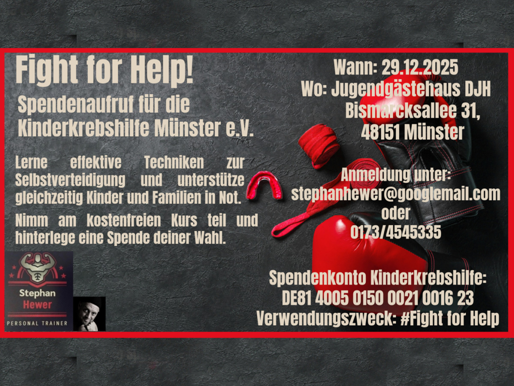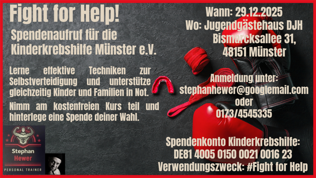 Statt einer Kursgebühr bittet Stephan Hewer um eine Spende für die Kinderkrebshilfe Münster auf das Konto: DE81 4005 0150 0021 0016 23 mit dem Verwendungszweck: #Fight for Help