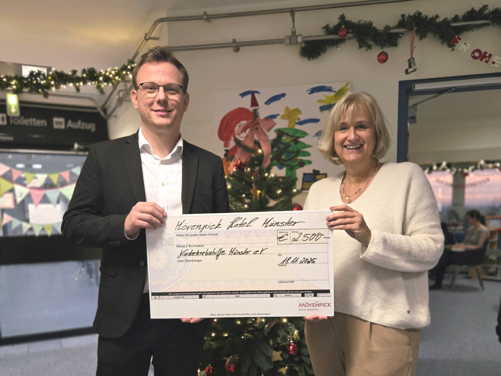 Tobias Meyer, Sales Manager des Hotels Mövenpick, traf sich nach diesem Event mit Nicole Wiggermann, Vorstandsmitglied der Kinderkrebshilfe Münster, auf der kinderonkologischen Station des UKM und übergab einen symbolischen Spendenscheck über 2.500 €. Die Summe setzt sich zusammen aus 1.680 € der Spenden des Abends, die von Dr. Marie-Theres Thiell auf 2.000 € aufgerundet und von einer weiteren Teilnehmenden um weitere 500 € aufgestockt wurde.