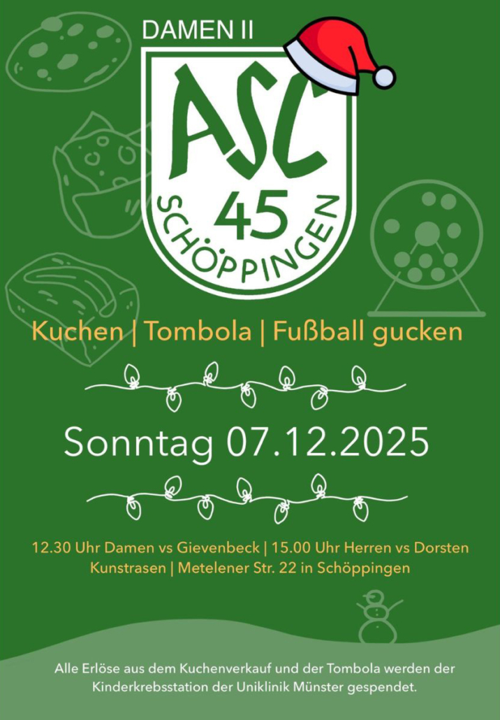 Unter dem Motto „Kuchen, Tombola, Fußball gucken“ veranstaltete die Damen-II-Mannschaft des ASC Schöppingen am Sonntag, dem 7. Dezember 2025, eine Spendenaktion für die Kinderkrebshilfe Münster. Während der Tombola konnten die Besucher bei Kaffee und Kuchen die Meisterschaftsspiele der 1. Damen- sowie der 1. Herrenmannschaft verfolgen. Die Tombola-Preise wurden von zahlreichen Sponsorinnen und Sponsoren gestiftet. Auch die AXA Entwicklungs- und Maschinenbau GmbH stellte mehrere Gewinne zur Verfügung und leistete mit 200 € einen zusätzlichen Beitrag zum Spendenerlös.