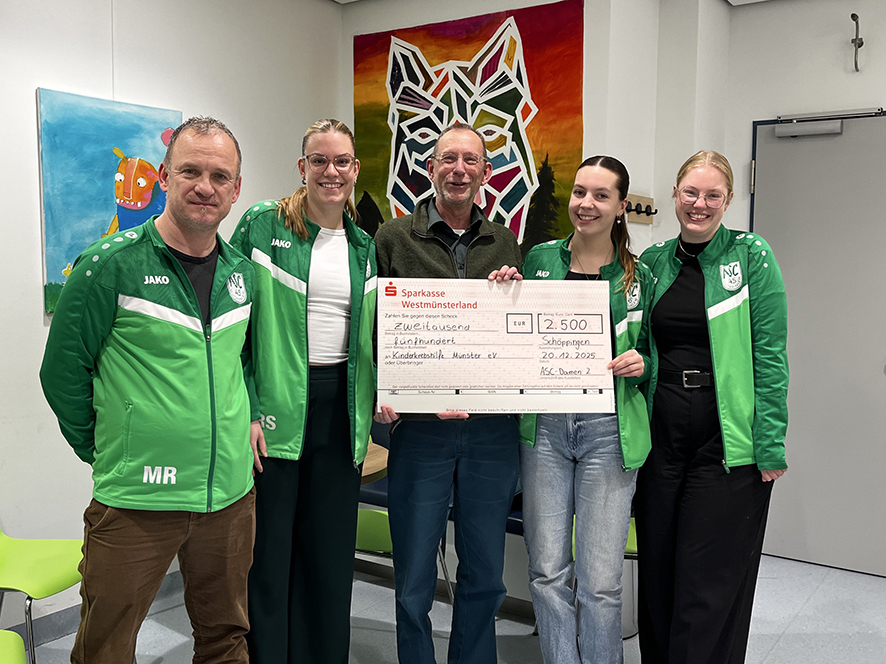 Am Samstag vor Weihnachten besuchte eine Abordnung der Mannschaft die kinderonkologische Station 17 am UKM, wo sie den symbolischen Spendenscheck an Norbert Gebker vom Vorstand der Kinderkrebshilfe überreichten. Dieser informierte die Delegation ausführlich über die vielfältigen Aktivitäten des Vereins und über den Einsatz der Spenden.