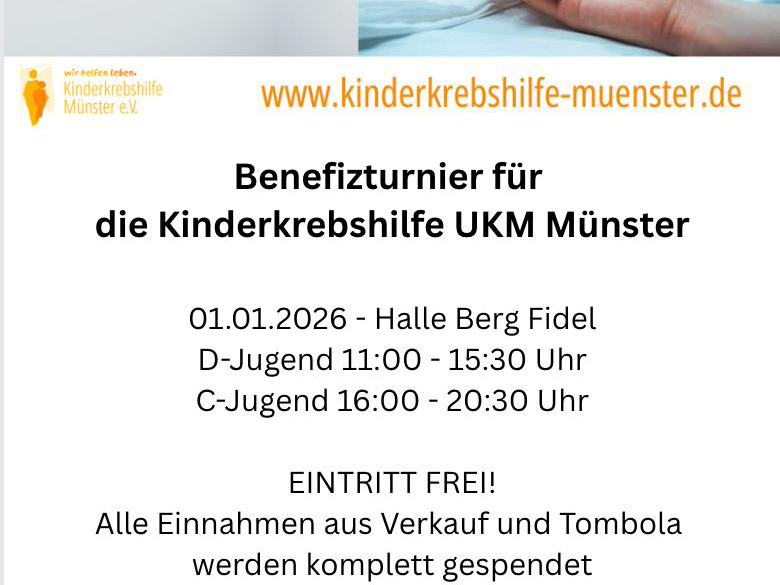 Am 1. Januar 2026 findet in der Sport- und Veranstaltungshalle Berg Fidel findet ein Fußballturnier statt, bei dem jeweils acht Mannschaften in den Altersklassen U13 und U15 gegeneinander antreten. Das Neujahrsturnier wird vom 1. FC Gievenbeck organisiert. Der Erlös aus der Tombola und aus dem Verkauf von Speisen und Getränken kommt der Kinderkrebshilfe Münster zugute.