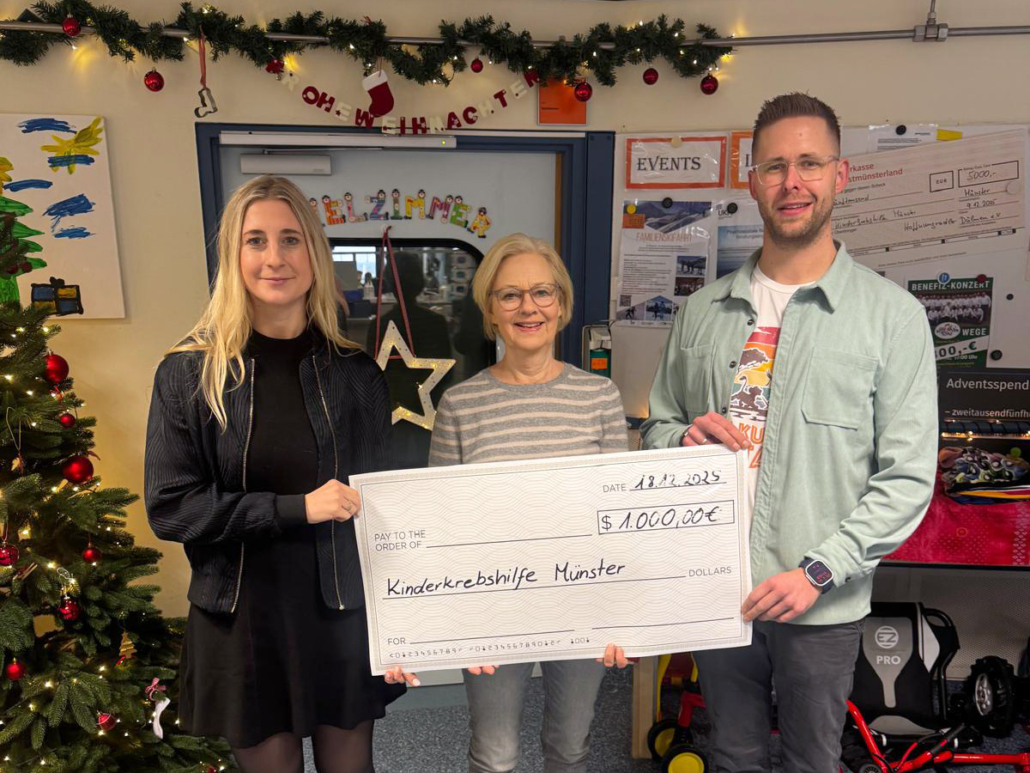 Mitte Dezember 2025 machten sich Isabell Egelkamp und André Rählmann von der Sanitär- und Heizungsfirma Andreas Egelkamp GmbH&Co.KG aus Recke auf den Weg nach Münster zum Uniklinikum Münster (UKM). Im Vorfeld hatte die Firma eine kostenfreie Informationsveranstaltung über Wärmepumpen angeboten und dafür um eine freiwillige Spende für die Kinderkrebshilfe Münster gebeten.