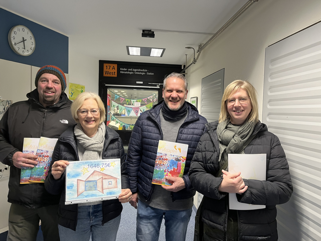 Mitte Januar traf sich eine Abordnung der Freundesgruppe aus Epe mit Anette Blomberg auf der kinderonkologischen Station. Anja und Stefan Borchardt, deren Tochter vor vielen Jahren onkologisch erkrankt war, sowie Christian Spelmink überreichten der Kinderkrebshilfe Münster symbolisch die Spende über 1.645,75 €.