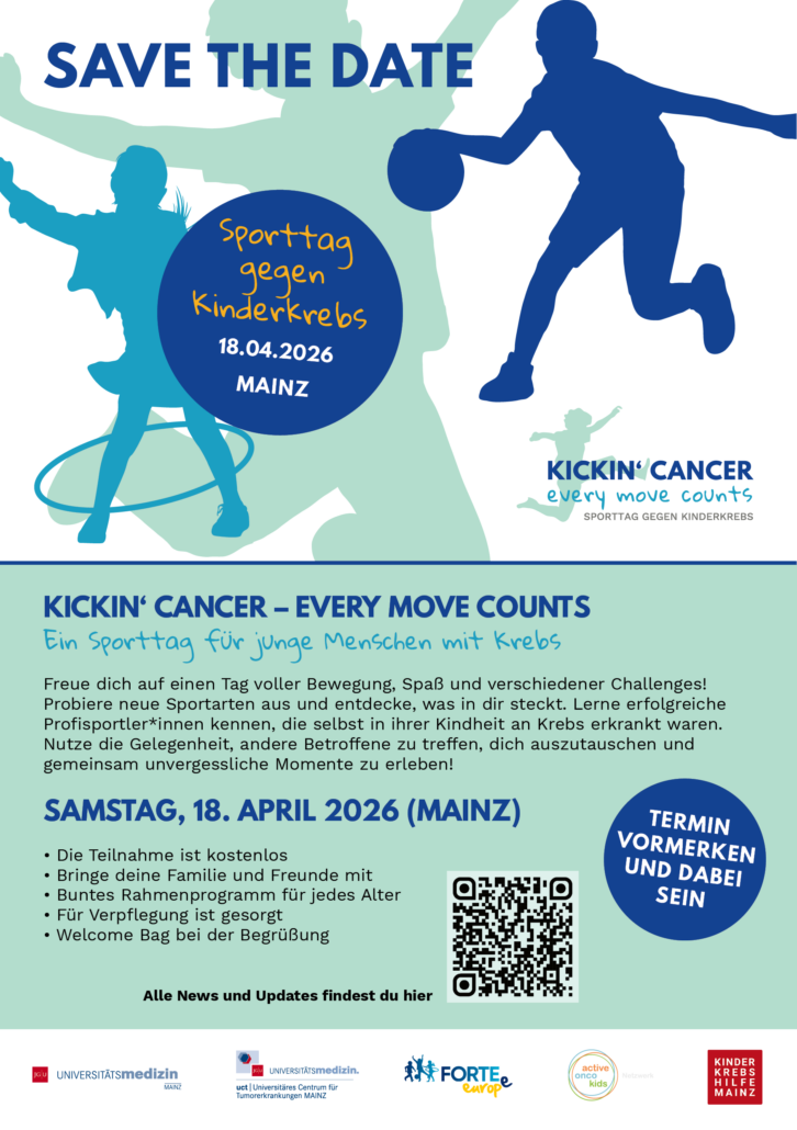 am Samstag, den 18. April 2026, findet von 10:00 bis 17:00 Uhr der internationale Sporttag „Kickin‘ Cancer – Every Move Counts“ in Mainz statt. Die Veranstaltung richtet sich bundesweit an Kinder, Jugendliche und junge Erwachsene, die an Krebs erkrankt sind oder waren, sowie an ihre Angehörigen.