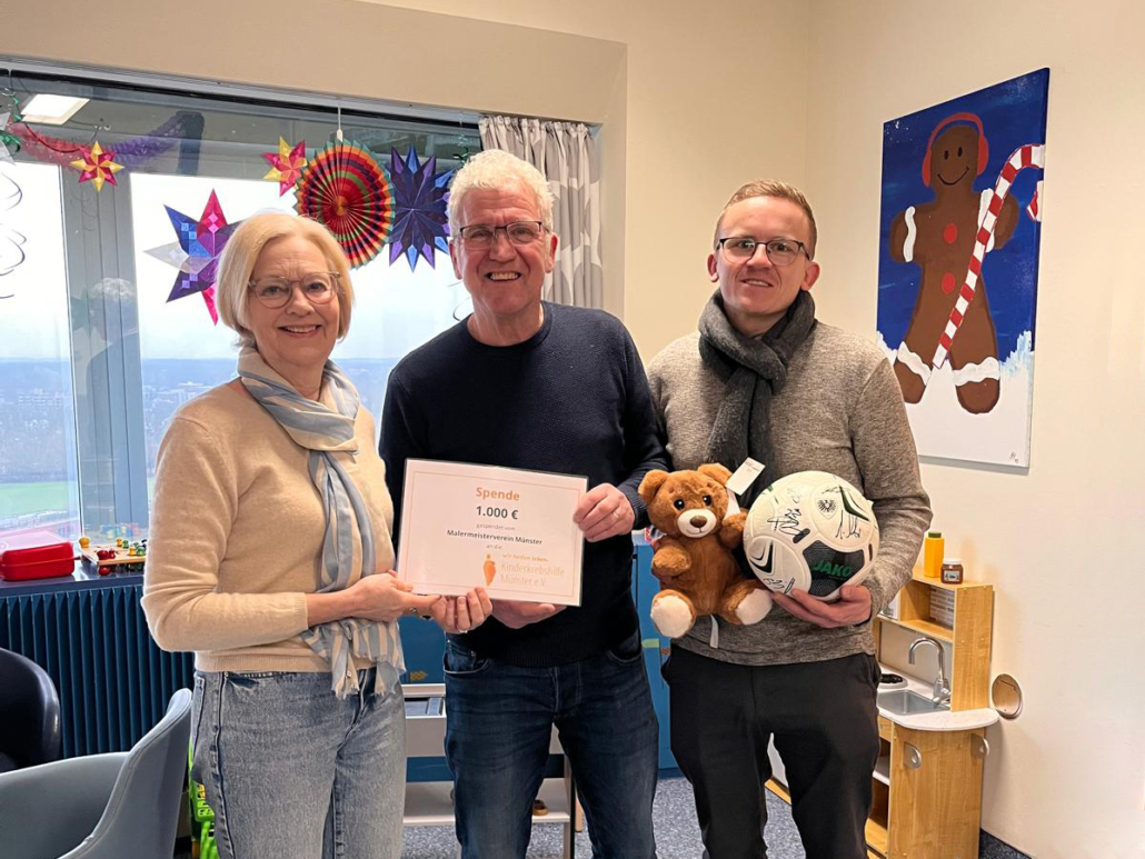 In der ersten Februarwoche 2026 besuchten die Malermeister Konstantin Scholz-Sadebeck und Martin Pedowski die kinderonkologische Station des Uniklinikums Münster. Anette Blomberg, stellvertretende Vorsitzende der Kinderkrebshilfe Münster, begrüßte die beiden Mitglieder des Malermeistervereins. Sichtlich erfreut nahm sie den symbolischen Spendenscheck entgegen und berichtete, was die Kinderkrebshilfe auf der Station mit Spendengeldern finanziert.